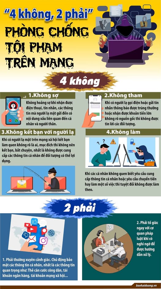 [Inforgraphic] "4 KHÔNG, 2 PHẢI" PHÒNG, CHỐNG TỘI PHẠM TRÊN KHÔNG GIAN MẠNG Theo khuyến cáo của Sở Văn hóa, Thể thao và Du lịch, người dân cần thực hiện tốt "4 không, 2 phải" để phòng ngừa bị lừa đảo, chiếm đoạt tài sản qua mạng../.